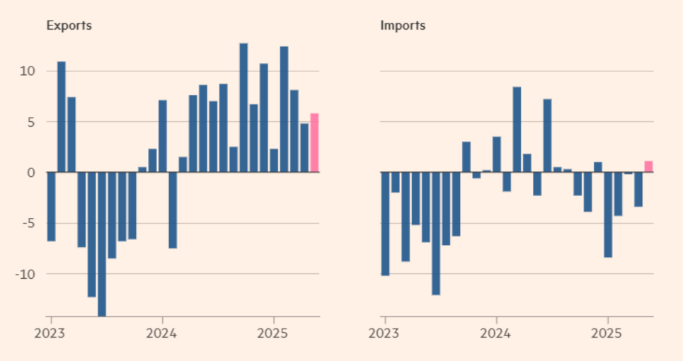China has been on the receiving end on the maximum number of retaliations along with US Markets, top tech and retail stocks dipping red, majorly due to US’ heavy reliance on Chinese imports. In fact, amidst the growing uncertainty regarding sweeping tariffs on August 1, Chinese ports saw a major uptick in its import and exports. Chinese exports rose 5.8% YoY in dollar terms in June beating expectations of 5% from a Reuters poll.