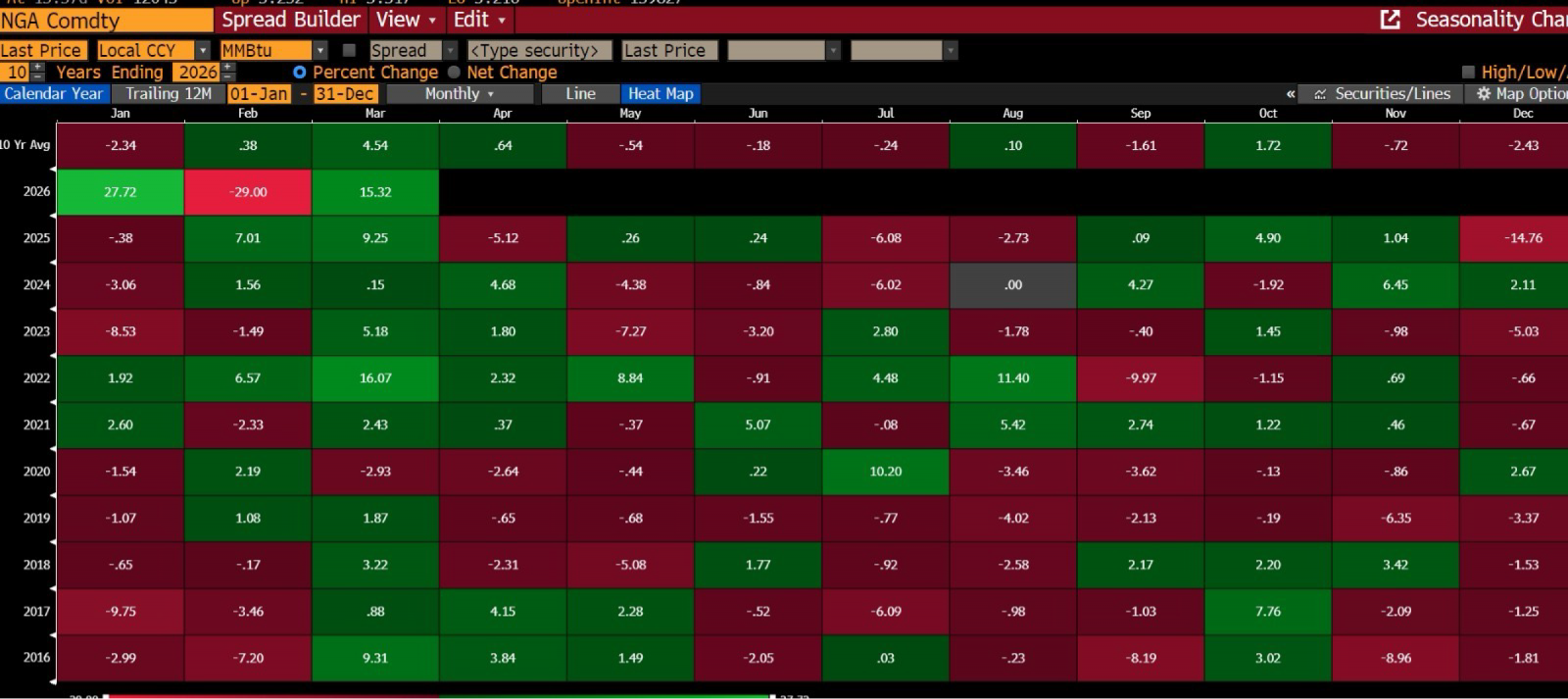 The seasonality chart shows that March has historically been a supportive month for natural gas prices. Over the past decade, the month has delivered a strong average performance of around 4.54%, making it one of the more consistently positive months in the calendar. This seasonal strength often reflects late-winter demand dynamics and tightening supply expectations. Overall, historical trends indicate that March tends to be a relatively favourable period for natural gas price performance compared with many other months of the year.