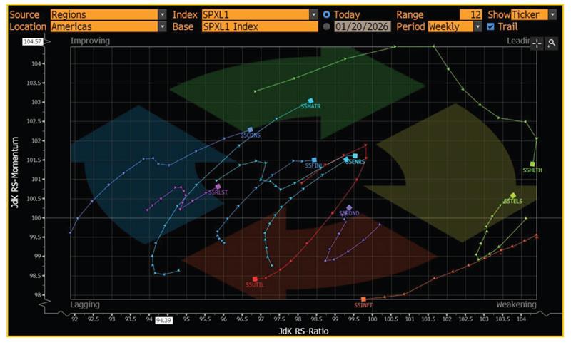 - Based on economic forecasts, consumer spending in the US is expected to decline to 2% in 2026, down from 3.5% growth in 2025. The quarterly CPI forecasts indicate an increase from 2.7% in Q4 2025 to 3% in Q2 2026. In contrast, the average hourly earnings are expected to decelerate from 3.7% in Q4 2025 to 3.4% in Q2 2026. Moreover, the unemployment rate is expected to inch up to 4.5% in 2026 from 4.3% in 2025. According to the University of Michigan consumer sentiment survey, the index remains at 54, nearly 25% below last January's reading. In such an environment, consumers typically shift their spending towards essentials and delay their discretionary (non-essential) purchases. Hence, the consumer staples (XLY) may outperform the consumer discretionary (XLP), reinforcing defensive spending behaviour.