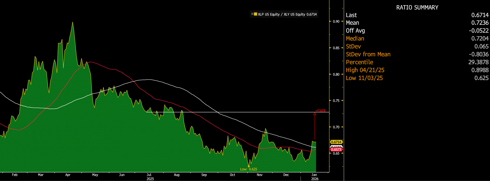 - Based on economic forecasts, consumer spending in the US is expected to decline to 2% in 2026, down from 3.5% growth in 2025. The quarterly CPI forecasts indicate an increase from 2.7% in Q4 2025 to 3% in Q2 2026. In contrast, the average hourly earnings are expected to decelerate from 3.7% in Q4 2025 to 3.4% in Q2 2026. Moreover, the unemployment rate is expected to inch up to 4.5% in 2026 from 4.3% in 2025. According to the University of Michigan consumer sentiment survey, the index remains at 54, nearly 25% below last January's reading. In such an environment, consumers typically shift their spending towards essentials and delay their discretionary (non-essential) purchases. Hence, the consumer staples (XLY) may outperform the consumer discretionary (XLP), reinforcing defensive spending behaviour.