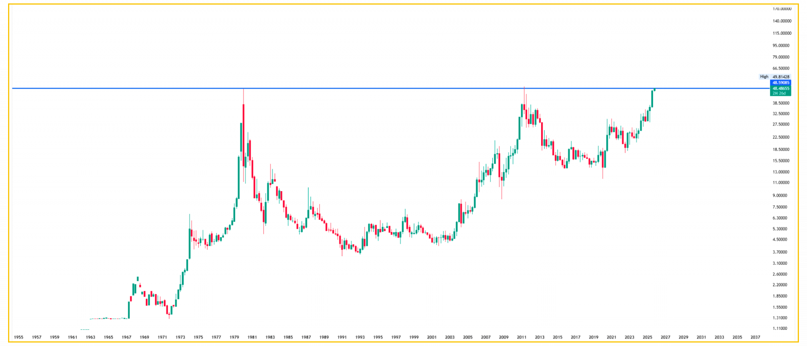 Silver is approaching a pivotal moment, trading near $48.6/oz, just below its historic highs from 1980 and 2011. The metal is now completing a multi-decade cup-and-handle pattern, one of the most powerful continuation formations in technical analysis. The “cup” spans more than four decades of consolidation, reflecting repeated cycles of boom and correction, while the emerging “handle” represents the final phase of accumulation before a potential breakout. A sustained move above the $49–50/oz resistance would confirm this pattern, signaling the beginning of a new long-term uptrend that could redefine silver’s role in global portfolios.