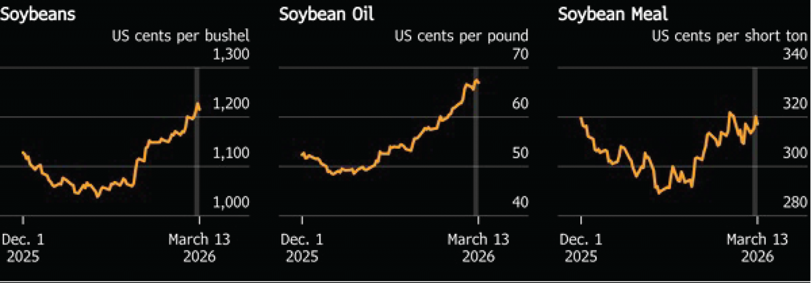 US-Israel strikes on Iran have pushed Brent crude to approximately $100/barrel, with the Strait of Hormuz remaining disrupted. This would increase the demand for biofuels, thereby increasing the demand for soybean oil. Soybean oil is the primary feedstock for renewable diesel, a cleaner-burning fuel that can be used directly in any engine without modification. With crude elevated post-conflict, demand has intensified as refiners and fleet operators seek cheaper alternatives