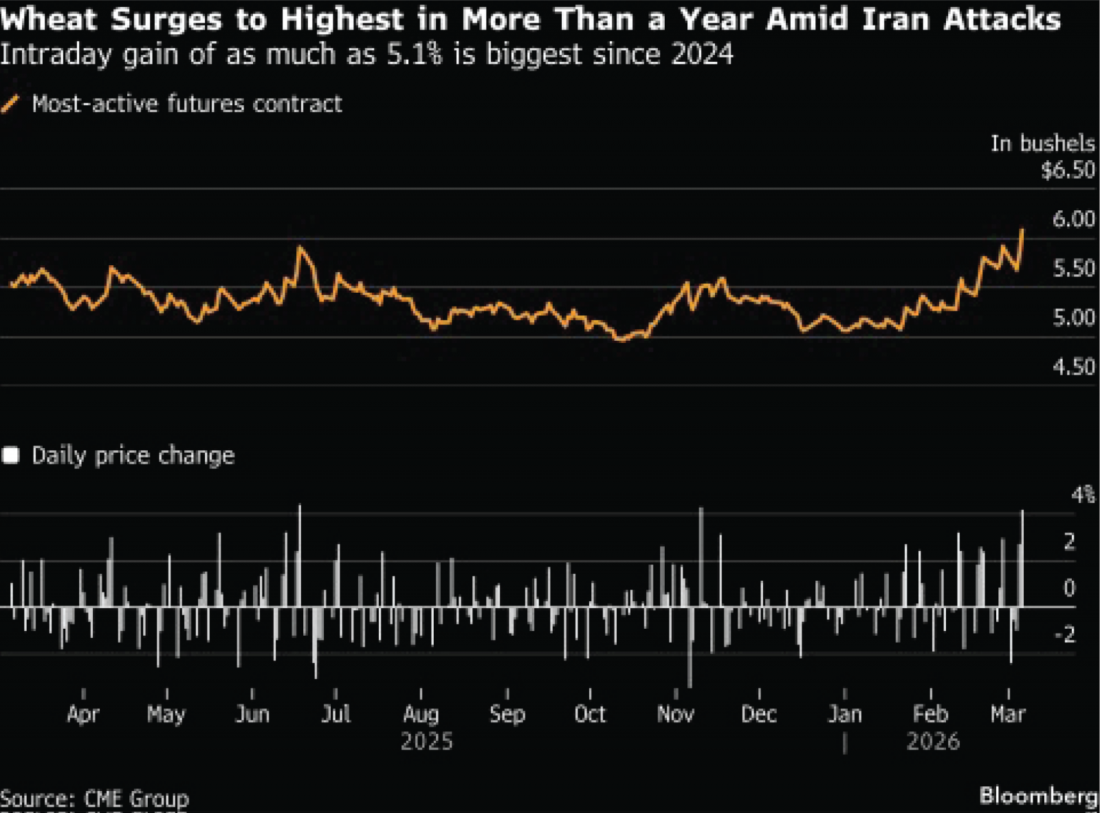 Chicago wheat futures have risen as much as 5.7% since the start of the Iran-US Conflict. The move has not been driven by a shift in fundamentals; instead, wheat is being treated as a defensive agricultural commodity during periods of geopolitical tension.