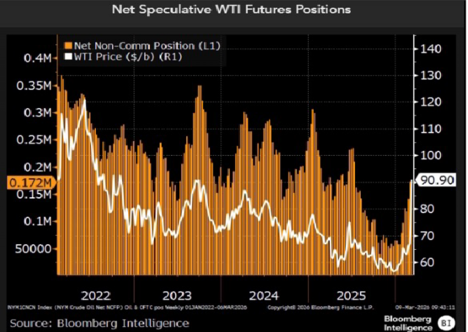 Non-commercial net long positions in Nymex WTI crude futures continue to climb, reaching 172,150 contracts for the week ended March 6 from 64,591 during the week of Jan. 2, CFTC data show. WTI prices have skyrocketed 166.5% during that time span. The rebound suggests traders are unwinding bearish bets amid supply disruptions in the Strait of Hormuz, heightening market anxiety.