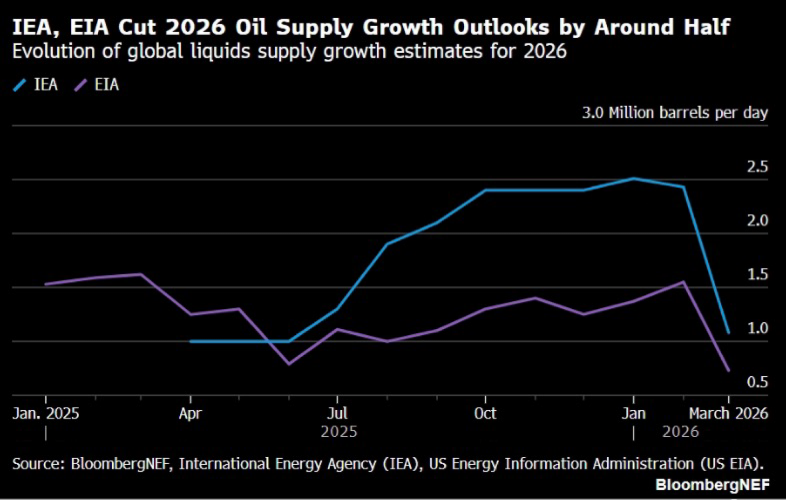 The IEA estimates the disruption could cut global supply by about 8 million bpd in March to 98.8 million barrels per day. This will be the lowest level since the first quarter of 2022. The market price action reflects that this news outweighs the recent plan by 32-member countries to release around 400 million barrels from reserves, including 172 million barrels from the US. The agency cut its 2026 supply growth outlook by about 45% to roughly 1.1 million barrels per day, with the entire increase coming from non-OPEC+ producers. The US Energy Information Administration also reduced its 2026 supply-growth forecast to 730,000 barrels per day, down 53% from last month.