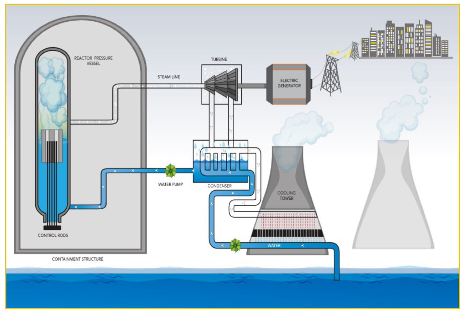 Inside the reactor vessel, the fuel rods are immersed in water, where the chemical reaction produces steam that drives the turbine and generates electricity.