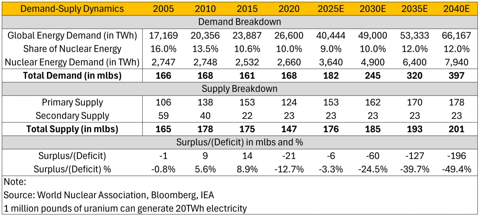 Looking at the demand and supply dynamics as of 2025, the demand for uranium was 182 million pounds (mlbs), while supply was 176 mlbs, implying a deficit of about 3%. Looking ahead, by 2040, the deficit is expected to increase to as high as 50% as the demand soars to a little under 400 mlbs.