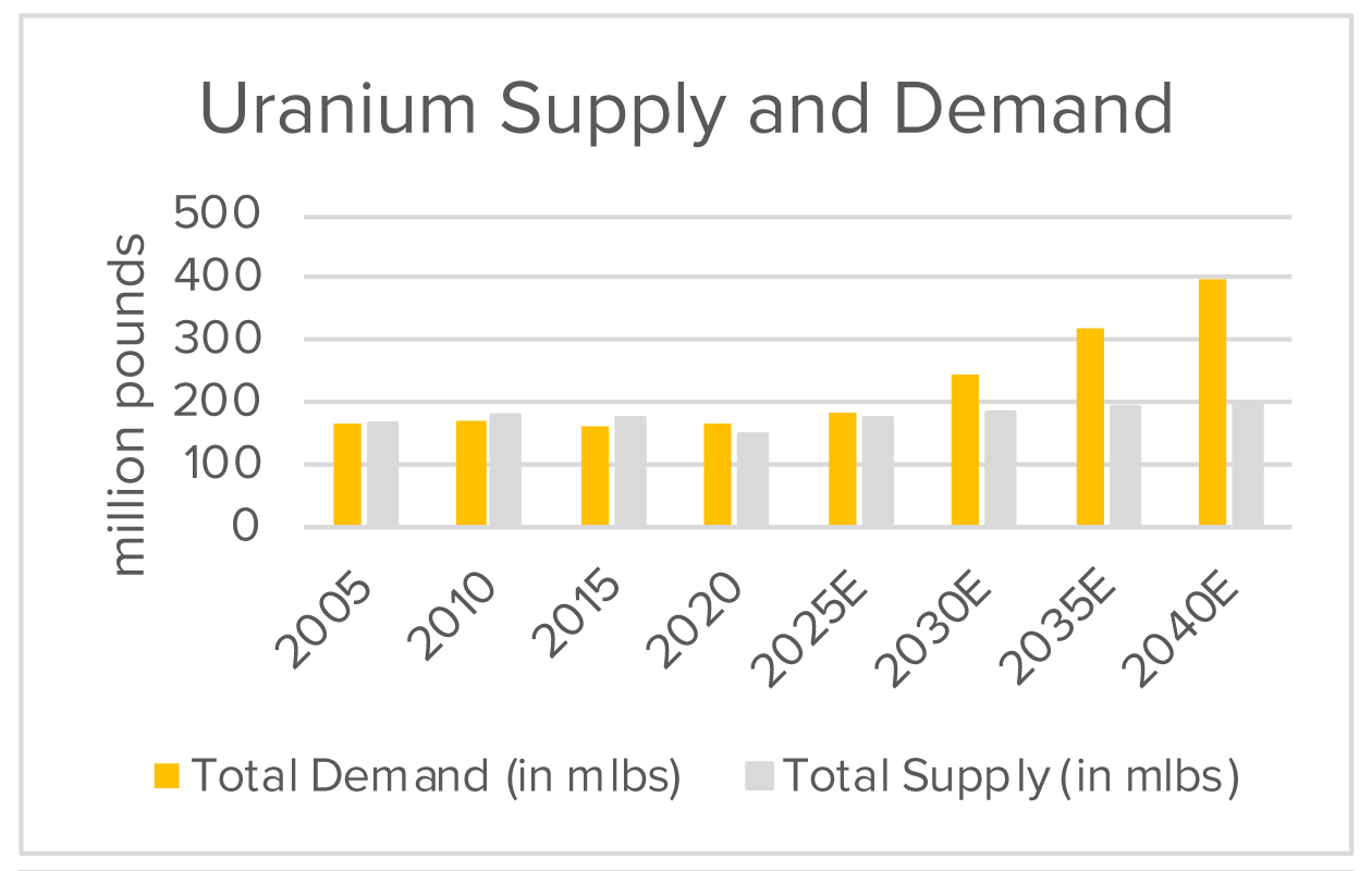 On the supply side, it typically takes about 10-15 years from initial discovery and exploration; however, if feasible, then the mines can run for 20-40 years. Hence, this bottleneck in discovery and exploration limits the supply, even though the globally identified recoverable uranium resources amount to 17.5 Kmlbs.