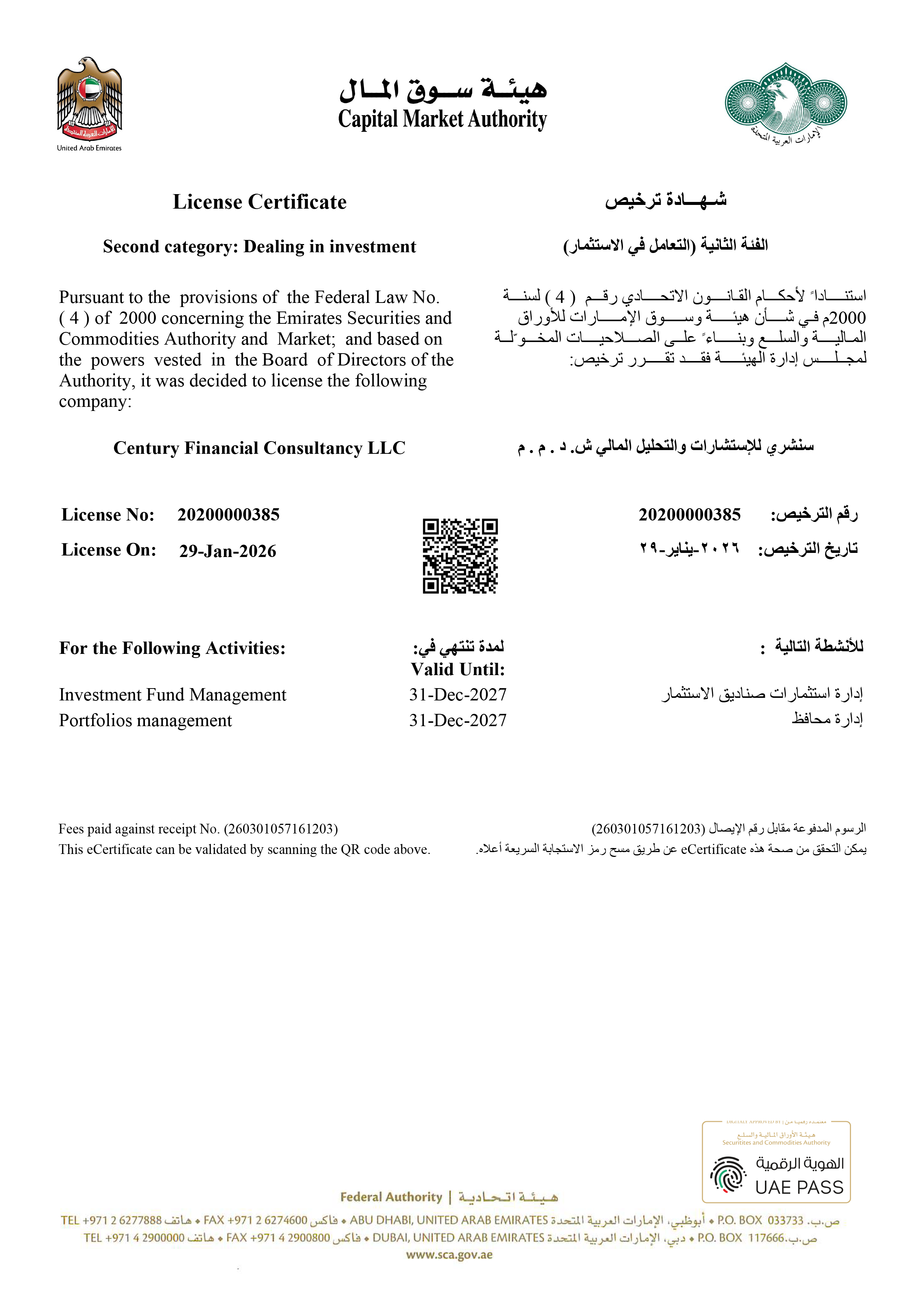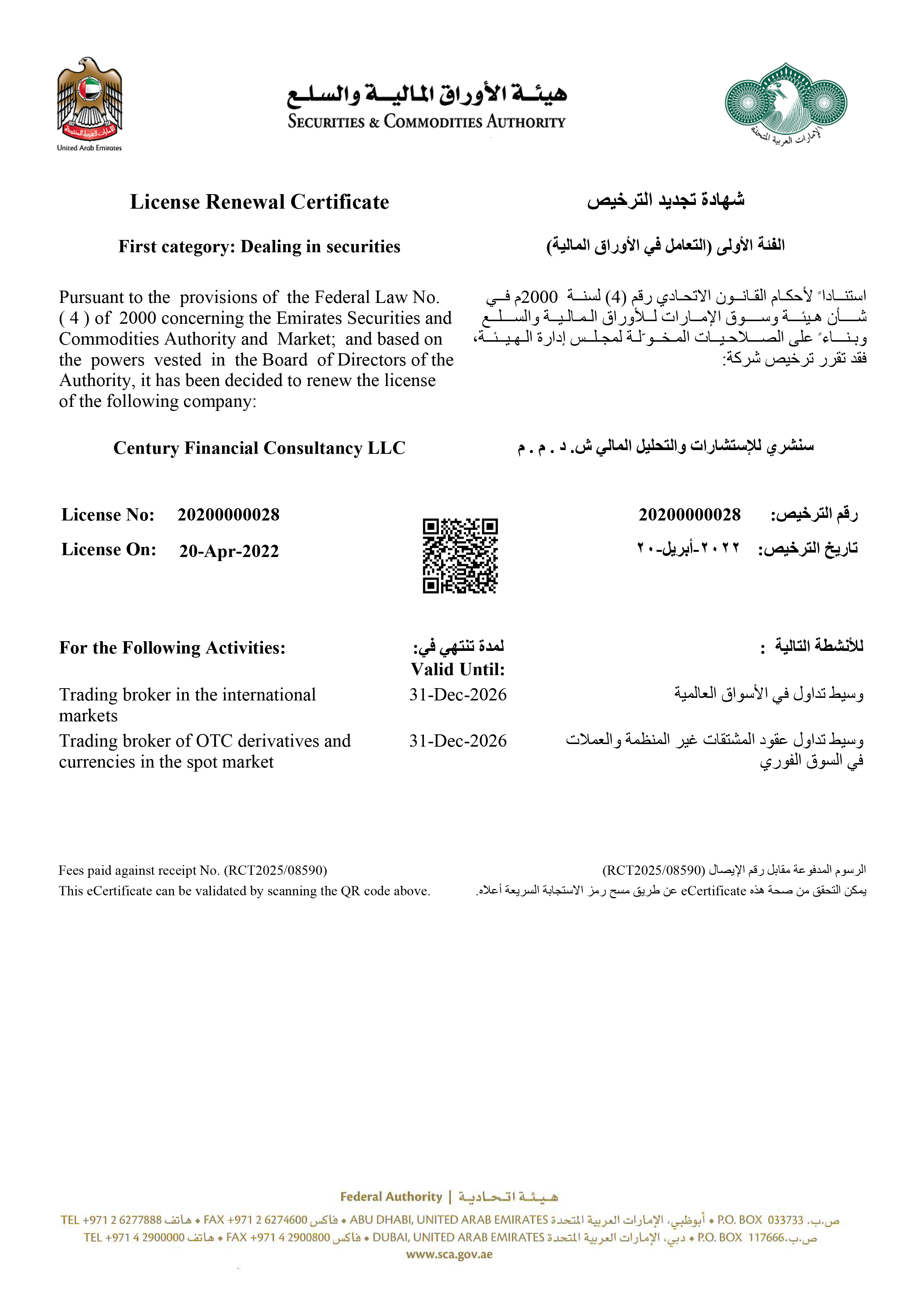 Century Financial Consultancy LLC (CFC) is duly licensed and regulated by the Securities and Commodities Authority of UAE (SCA) under license numbers 20200000028 and, 301044 to practice the activities of Trading broker in the international markets, Trading broker of the OTC derivatives and currencies in the spot market, Introduction, Financial Consultations, and Promotion. CFC is a Limited Liability Company incorporated under the laws of UAE and registered with the Department of Economic Development of Dubai (registration number 768189). CFC has its registered office at 601, Level 6, Building no. 4, Emaar Square, Downtown, Dubai, UAE.